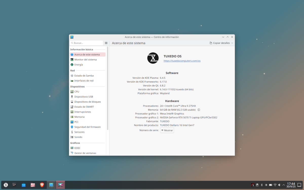 Como KDE neon, Tuxedo OS se basa en Ubuntu LTS, pero no aplica las actualizaciones de la misma forma. Un ejemplo: en estos momentos, ambas distribuciones están usando la base de Ubuntu 24.04.3 LTS, incluyendo a priori componentes como Linux 6.14 o Mesa 25.0… Pero si bien se nutren de la misma fuente, no distribuyen del mismo modo las actualizaciones: Tuxedo sirve versiones del kernel personalizadas, optimizadas para su hardware, y suele tardar unos días más en lanzarlas. Asimismo, están un poco más al día en soporte de hardware y el sistema ya usa Mesa 25.1. Por lo demás, todo es prácticamente igual.